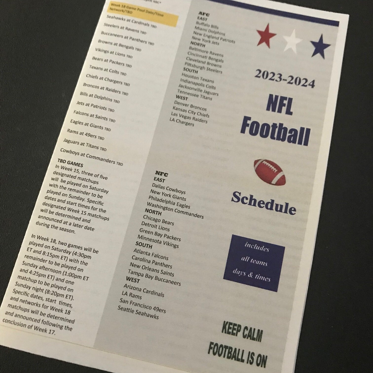 Football NFL 2023 2024 Schedule Patriotic Theme Etsy